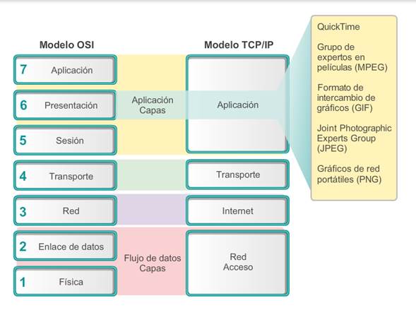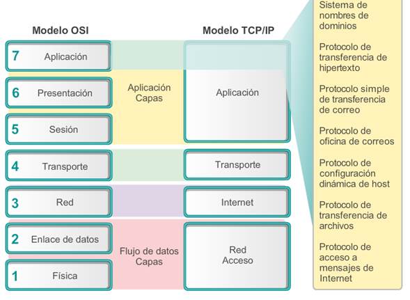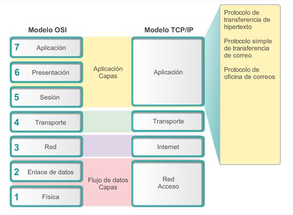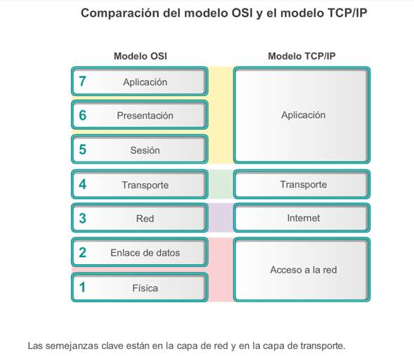 Nota: mientras que a las capas del modelo TCP/IP se hace referencia solo por el nombre, las siete capas del modelo OSI se mencionan con frecuencia por número y no por nombre. Por ejemplo, la capa física se conoce como capa 1 del modelo OSI.