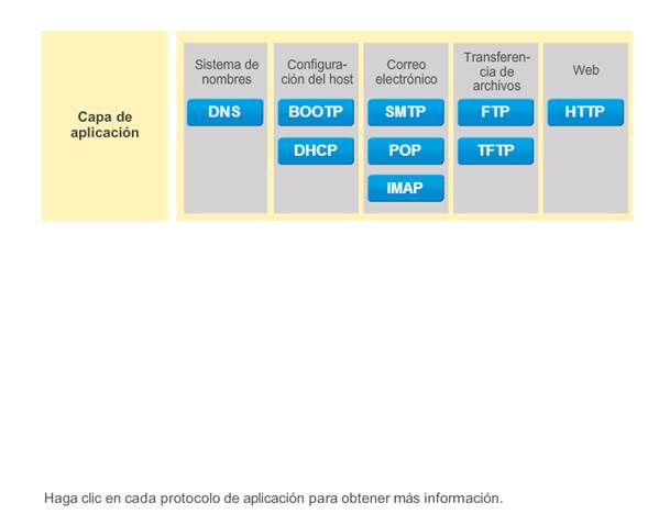 La capa de aplicación de TCP/IP incluye un número de protocolos que proporciona funcionalidad específica a una variedad de aplicaciones de usuario final. Las capas 5, 6 y 7 del modelo OSI se utilizan como referencias para proveedores y desarrolladores de software de aplicación para fabricar productos que funcionan en redes.