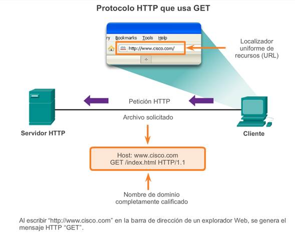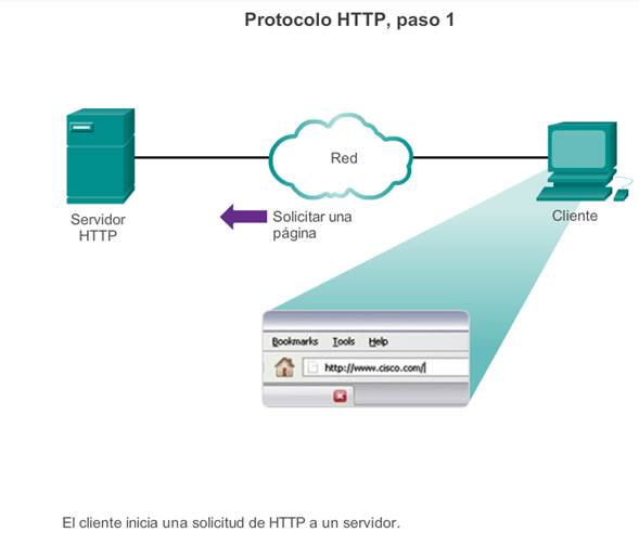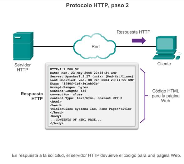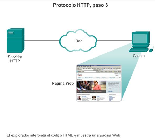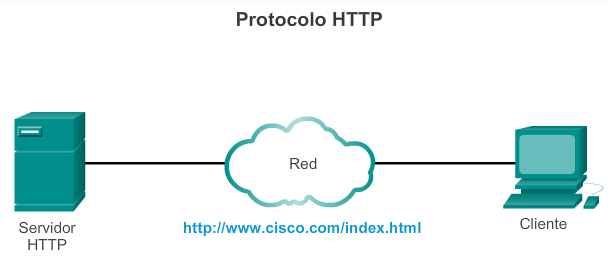 - Protocolo de aplicación: el protocolo de transferencia de hipertexto (HTTP) es un protocolo que rige la forma en que interactúan un servidor Web y un cliente Web. HTTP define el contenido y el formato de las solicitudes y respuestas intercambiadas entre el cliente y el servidor. Tanto el cliente como el software del servidor Web implementan el HTTP como parte de la aplicación. HTTP depende de otros protocolos para regular la forma en que los mensajes se transportan entre el cliente y el servidor.