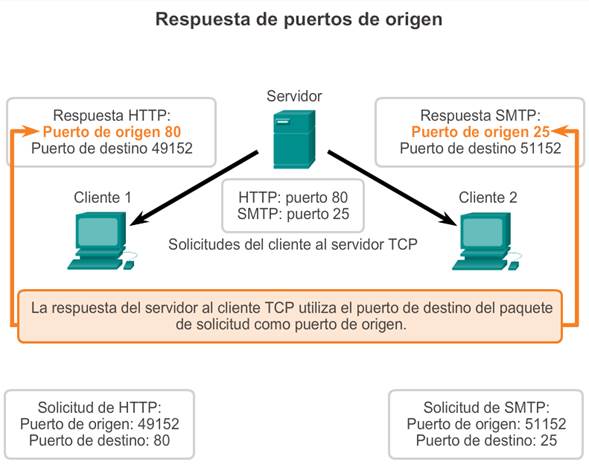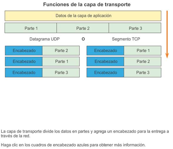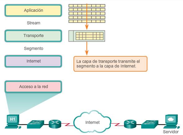 El protocolo de capa de aplicación, HTTP, comienza el proceso entregando los datos de la página Web con formato HTML a la capa de transporte. Allí, los datos de aplicación se dividen en segmentos de TCP. A cada segmento de TCP se le otorga una etiqueta, denominada encabezado, que contiene información sobre qué procesos que se ejecutan en la computadora de destino deben recibir el mensaje. También contiene la información que permite que el proceso de destino rearme los datos en su formato original.