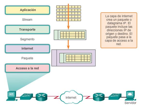 La capa de transporte encapsula los datos HTML de la página Web dentro del segmento y los envía a la capa de Internet, donde se implementa el protocolo IP. Aquí, el segmento de TCP se encapsula en su totalidad dentro de un paquete IP que agrega otro rótulo denominado encabezado IP. El encabezado IP contiene las direcciones IP de host de origen y de destino, como también la información necesaria para entregar el paquete a su proceso de destino correspondiente.