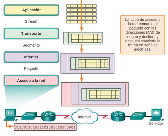 A continuación, el paquete IP se envía a la capa de acceso a la red, donde se encapsula dentro de un encabezado de trama y un tráiler. Cada encabezado de trama contiene una dirección física de origen y de destino. La dirección física identifica de forma exclusiva los dispositivos en la red local. El tráiler contiene información de verificación de errores. Por último, los bits se codifican en el medio mediante la tarjeta de interfaz de red (NIC) del servidor. Haga clic en el botón Reproducir de la ilustración para ver el proceso de encapsulación.