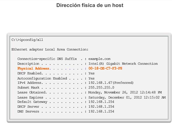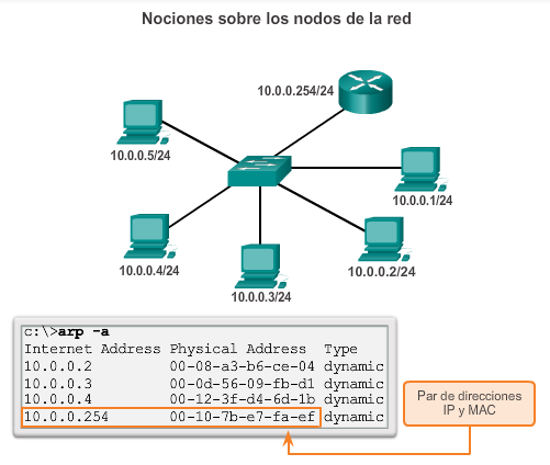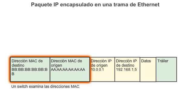 La mayoría de las aplicaciones de red dependen de la dirección IP lógica del destino para identificar la ubicación de los hosts entre los que se produce la comunicación. Se requiere la dirección MAC de enlace de datos para enviar el paquete IP encapsulado dentro de la trama de Ethernet a través de la red hasta el destino.