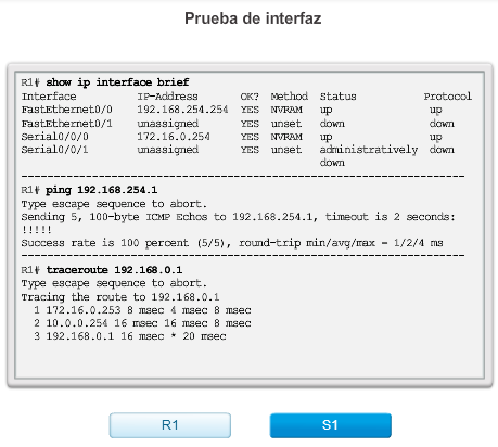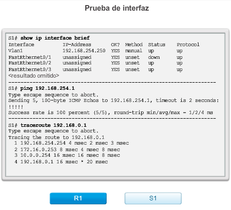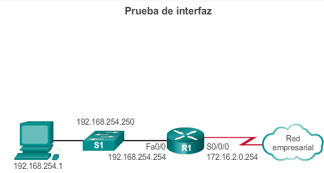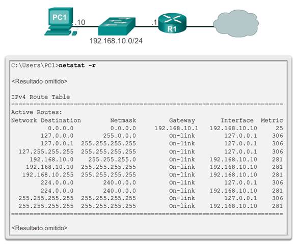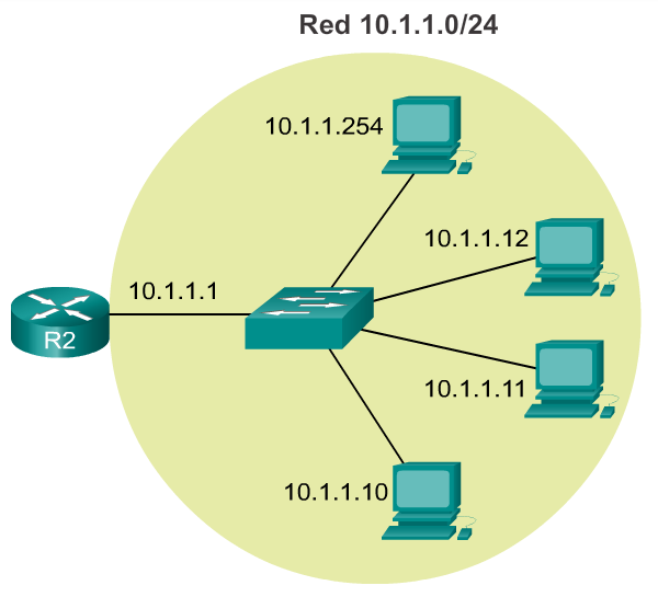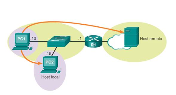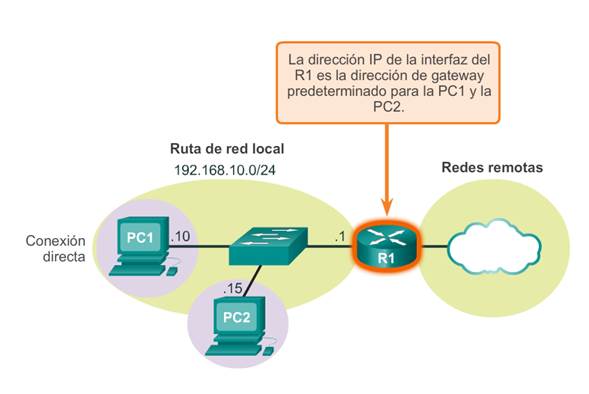 Cuando el emisor y el receptor del paquete IP se encuentran en redes diferentes, la trama de enlace de datos de Ethernet no se puede enviar directamente al host de destino, debido a que en la red del emisor no se puede tener acceso directamente al host. La trama de Ethernet se debe enviar a otro dispositivo conocido como “router” o “gateway predeterminado”. En nuestro ejemplo, el gateway predeterminado es R1. R1 tiene una interfaz y una dirección IP que se encuentra en la misma red que PC1. Esto permite que PC1 alcance el router directamente.