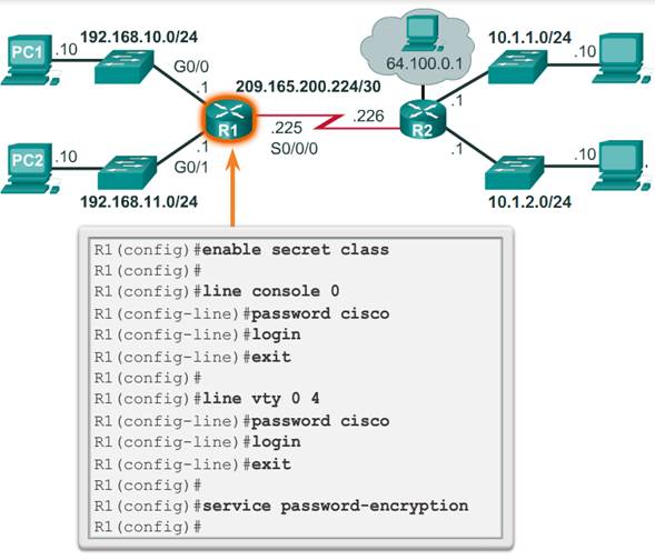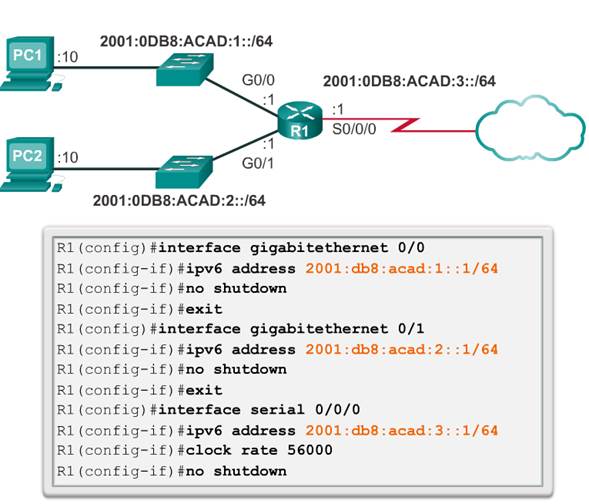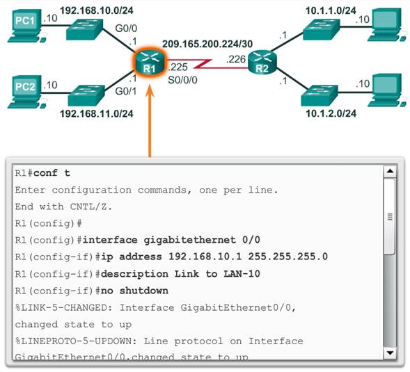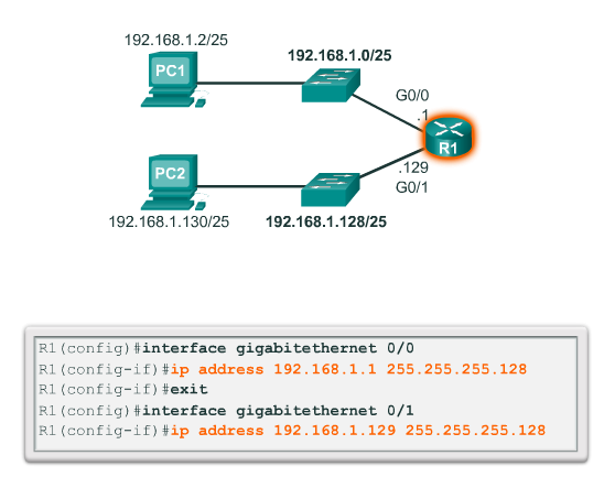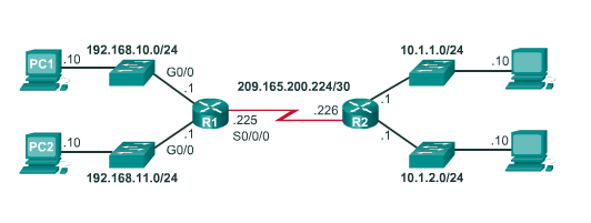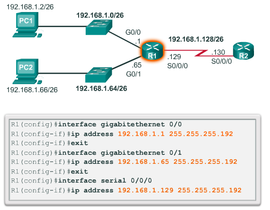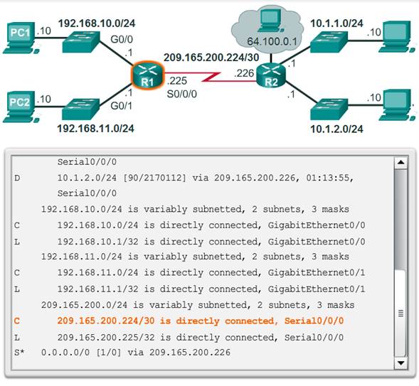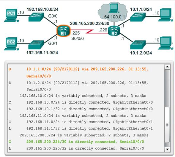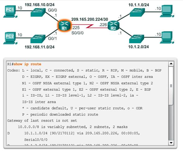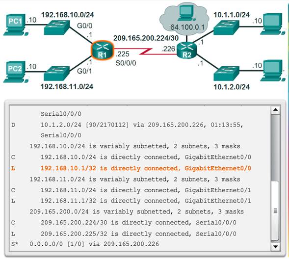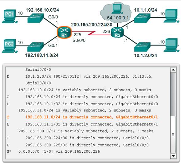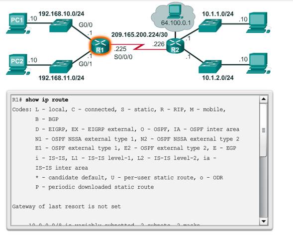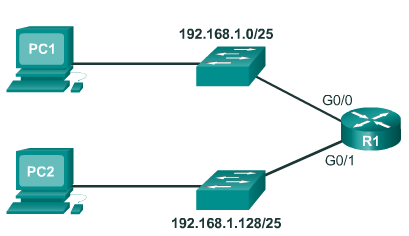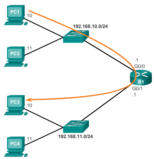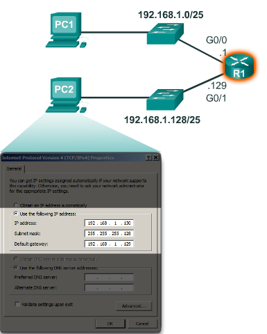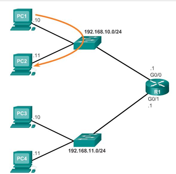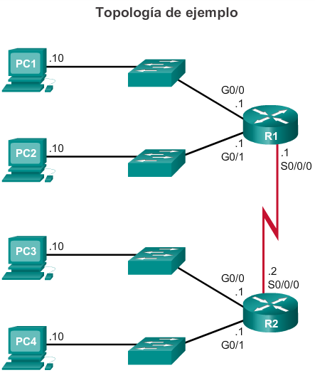 En la ilustración, los hosts en la LAN utilizan R1 como el gateway predeterminado con la dirección 192.168.1.1 establecida en la configuración de TCP/IP. Si el destino de una PDU se encuentra en una red IP distinta, los hosts envían las PDU al gateway predeterminado en el router para su posterior transmisión.