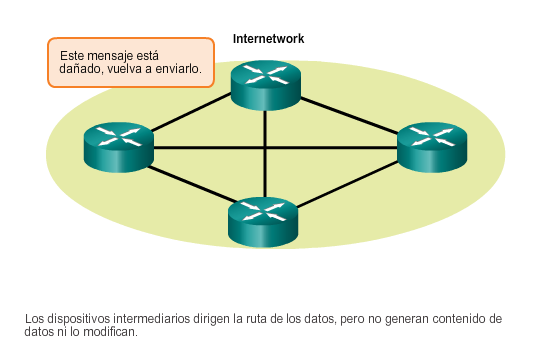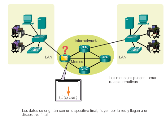 Varios tipos de dispositivos en toda la red participan para asegurar que las partes del mensaje lleguen a los destinos de manera confiable.