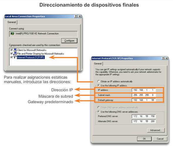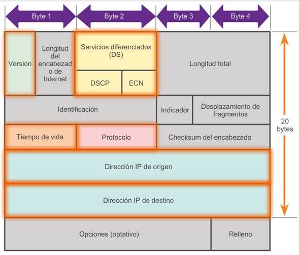 Las direcciones IP indican las direcciones de red y de los dispositivos de origen y de destino. Cuando el emisor del paquete se encuentra en una red distinta de la del receptor, las direcciones IP de origen y de destino representan los hosts en redes diferentes. Esto lo indica la porción de red de la dirección IP del host de destino.