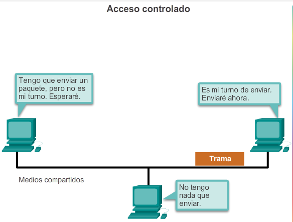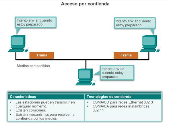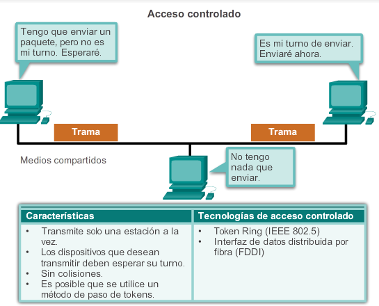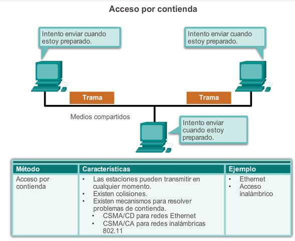 El método de acceso determina en qué momento alguien puede enviar un mensaje. Estas reglas de temporización se basan en el contexto. Por ejemplo: tal vez usted pueda hablar cada vez que quiera decir algo. En este contexto, una persona debe esperar hasta que nadie más esté hablando antes de comenzar a hablar. Si dos personas hablan a la vez, se produce una colisión de información, y es necesario que ambas se detengan y vuelvan a comenzar, como se muestra en la figura 1. De manera similar, las computadoras deben definir un método de acceso. Los hosts de una red necesitan un método de acceso para saber cuándo comenzar a enviar mensajes y cómo responder cuando se produce algún error.