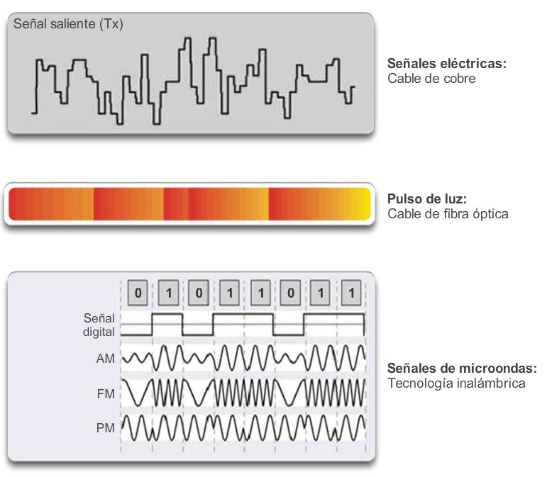 La codificación también tiene lugar en la comunicación por computadora, como se muestra en la figura 2. La codificación entre hosts debe tener el formato adecuado para el medio. El host emisor, primero convierte en bits los mensajes enviados a través de la red. Cada bit se codifica en un patrón de sonidos, ondas de luz o impulsos electrónicos, según el medio de red a través del cual se transmitan los bits. El host de destino recibe y decodifica las señales para interpretar el mensaje.