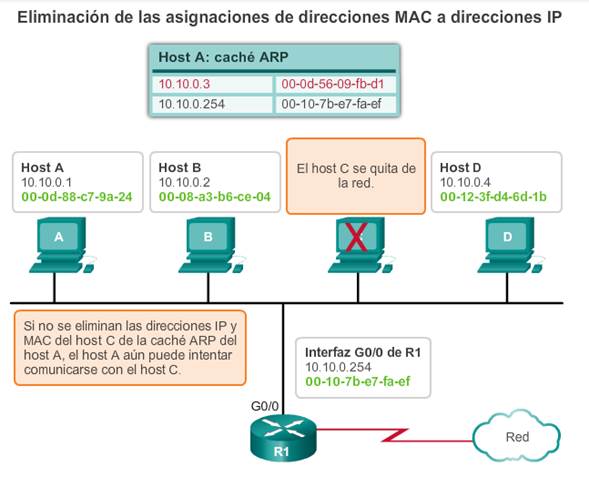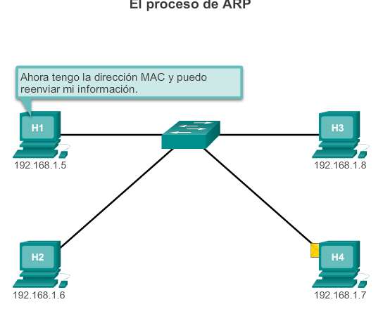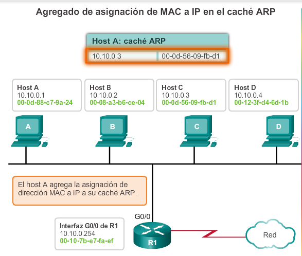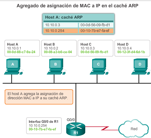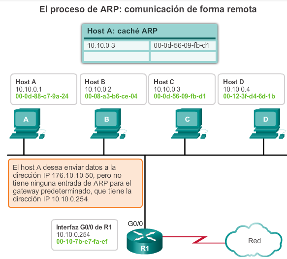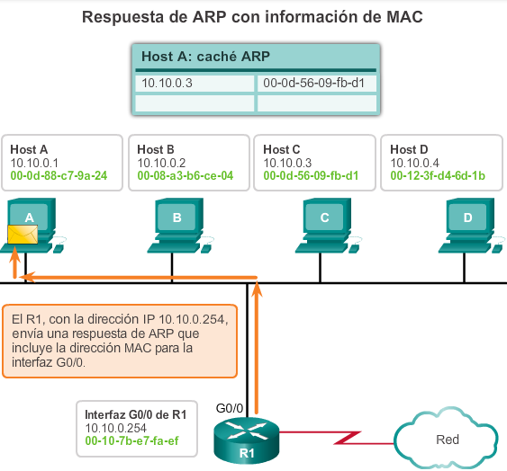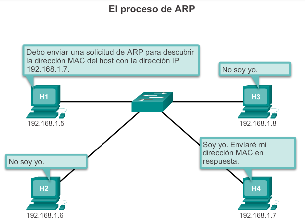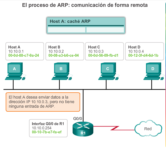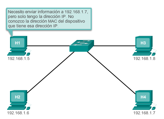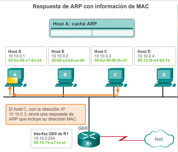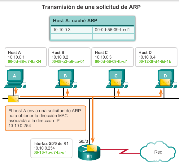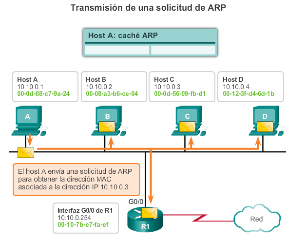 El host emisor utiliza un protocolo denominado “protocolo de resolución de direcciones” (ARP) para descubrir la dirección MAC de cualquiera de los hosts de la misma red local. El host emisor envía un mensaje de solicitud de ARP a toda la LAN. La solicitud de ARP es un mensaje de broadcast. La solicitud de ARP contiene la dirección IP del dispositivo de destino. Cada dispositivo en la LAN examina la solicitud de ARP para ver si contiene su propia dirección IP. Solamente el dispositivo con la dirección IP contenida en la solicitud de ARP responde con una respuesta de ARP. La respuesta de ARP incluye la dirección MAC asociada con la dirección IP en la solicitud de ARP.
