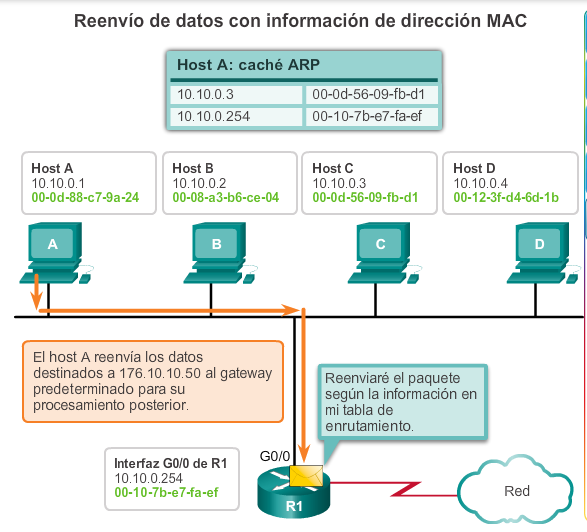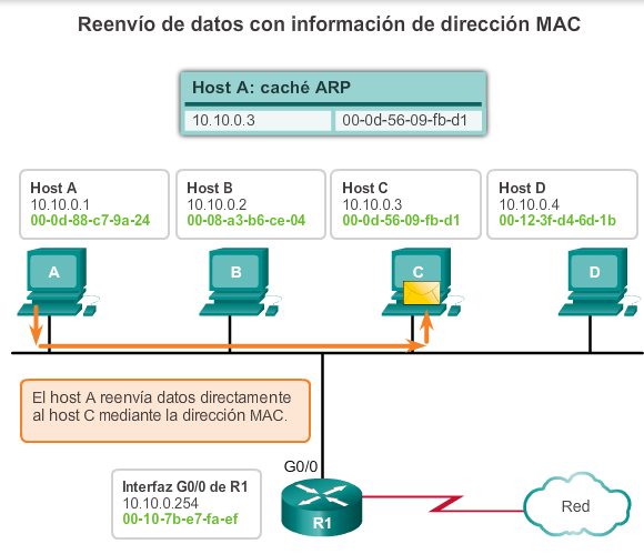 El método que utilizan los hosts para enviar mensajes a un destino en una red remota difiere de la manera en la que envían mensajes a un destino en la misma red local. Cuando un host necesita enviar un mensaje a otro host ubicado en la misma red, reenvía el mensaje de manera directa. El host utiliza el ARP para determinar la dirección MAC del host de destino. Incluye la dirección IP de destino dentro del encabezado del paquete y encapsula el paquete en una trama que contiene la dirección MAC del destino y lo reenvía.