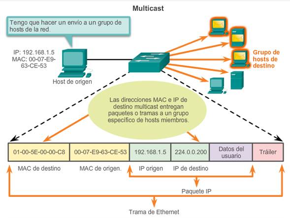 Si un host necesita enviar mensajes utilizando una opción de envío de uno a varios, se denomina “multicast”. Multicasting es el envío de un mismo mensaje a un grupo de hosts de destino de manera simultánea.