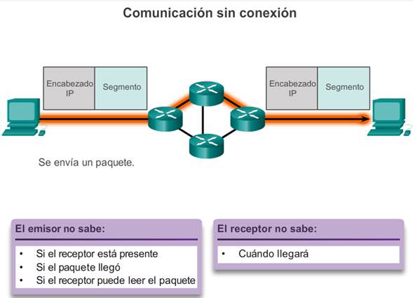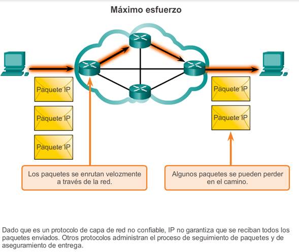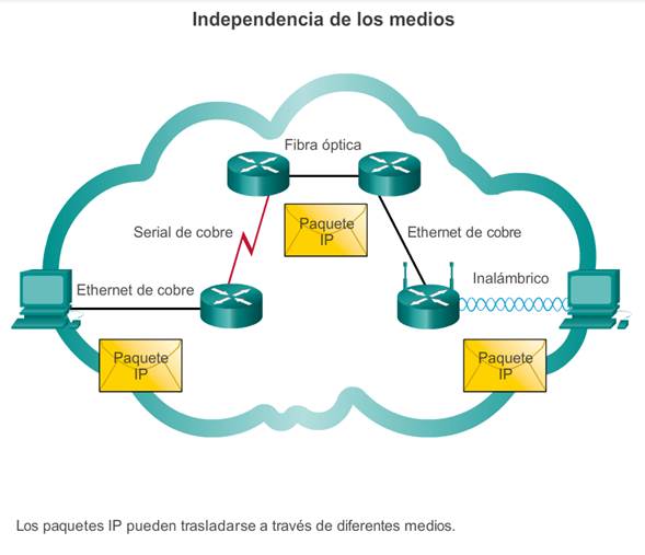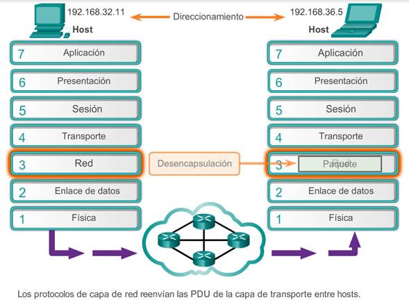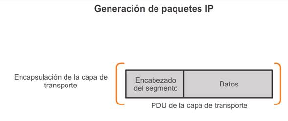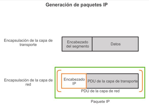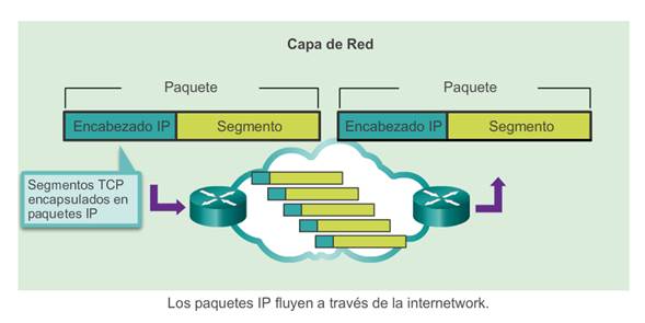 - Protocolo de Internet: IP es responsable de tomar los segmentos con formato de TCP, encapsularlos en paquetes, asignarles las direcciones adecuadas y enviarlos a través del mejor camino hacia el host de destino.