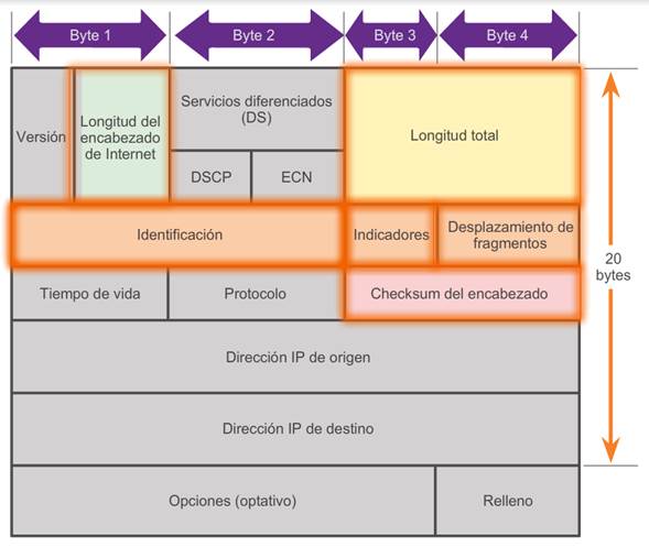 - Dirección IP de destino: la dirección IP del dispositivo receptor. Los routers utilizan la dirección IP de destino para reenviar un paquete a su destino.