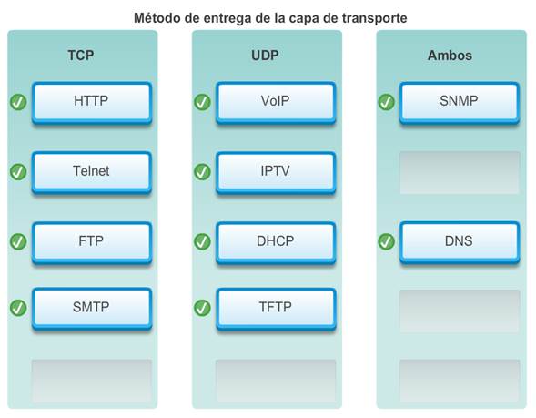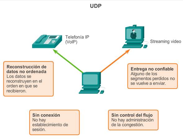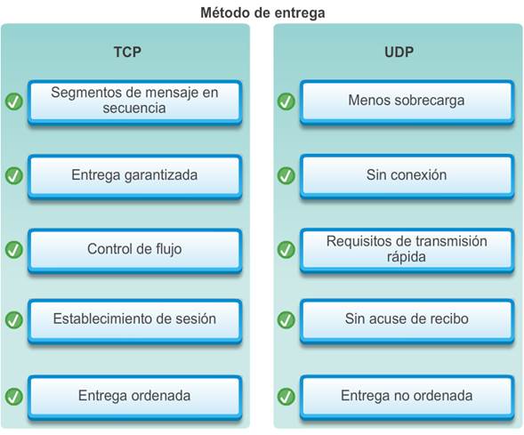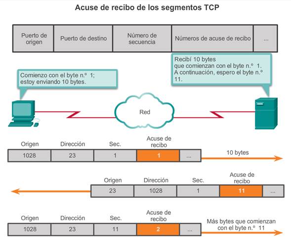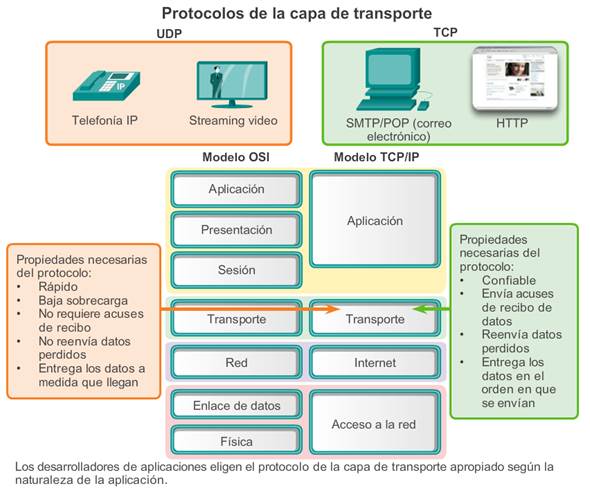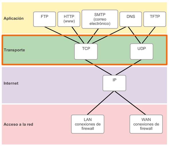 La capa 4, la capa de transporte del modelo OSI, describe los servicios y las funciones generales que proporcionan la entrega ordenada y confiable de datos entre los hosts de origen y de destino. Estas funciones incluyen acuse de recibo, recuperación de errores y secuenciamiento. En esta capa, los protocolos TCP/IP, el protocolo TCP y el protocolo de datagramas del usuario (UDP) proporcionan la funcionalidad necesaria.