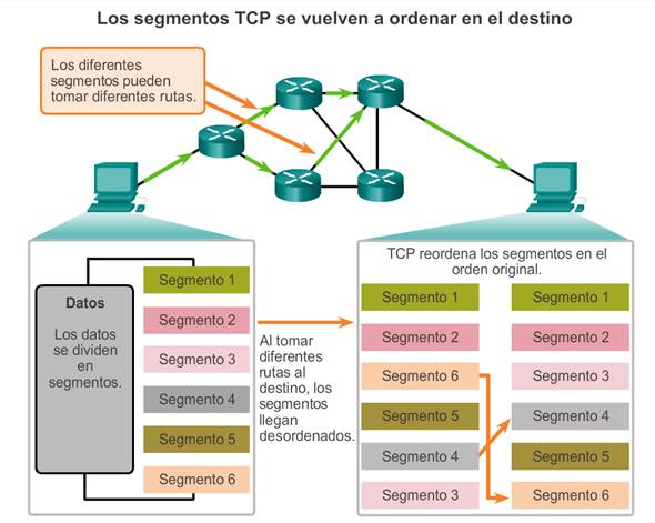 - La segmentación puede aumentar la confiabilidad de las comunicaciones de red. No es necesario que las partes separadas de cada mensaje sigan el mismo recorrido a través de la red desde el origen hasta el destino. Si una ruta en particular se satura con el tráfico de datos, o falla, las partes individuales del mensaje aún pueden direccionarse hacia el destino mediante los recorridos alternativos. Si parte del mensaje no logra llegar al destino, solo se deben retransmitir las partes faltantes.